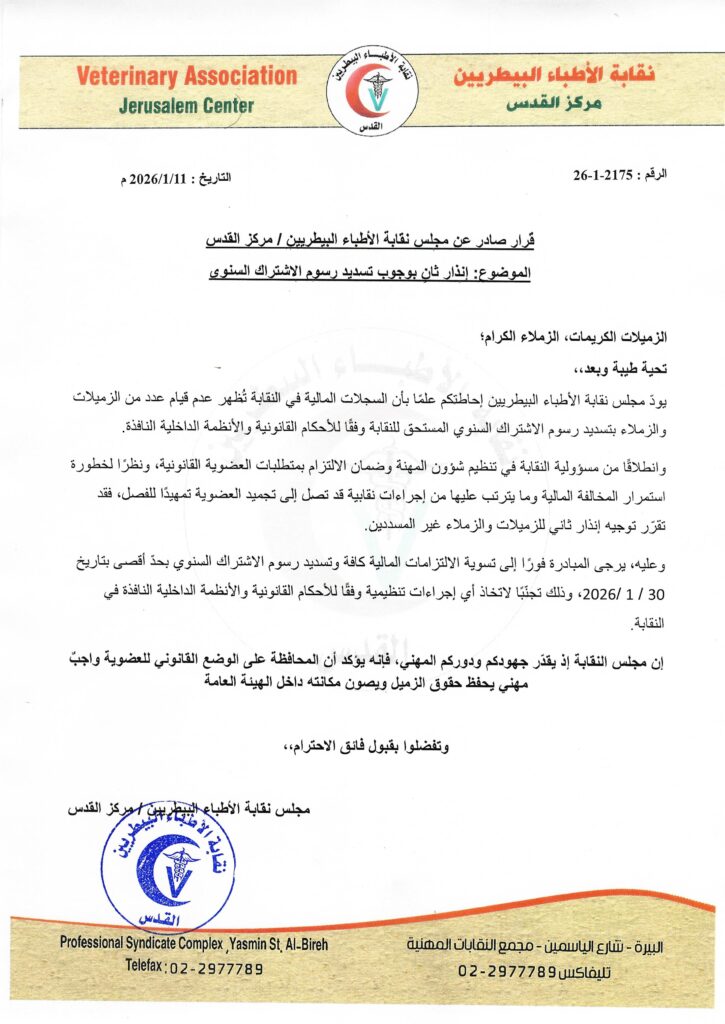 يودّ مجلس نقابة الأطباء البيطريين إحاطتكم علمًا بأن السجلات المالية في النقابة تُظهر عدم قيام عدد من الزميلات والزملاء بتسديد رسوم الاشتراك السنوي المستحق للنقابة وفقًا للأحكام القانونية والأنظمة الداخلية النافذة.