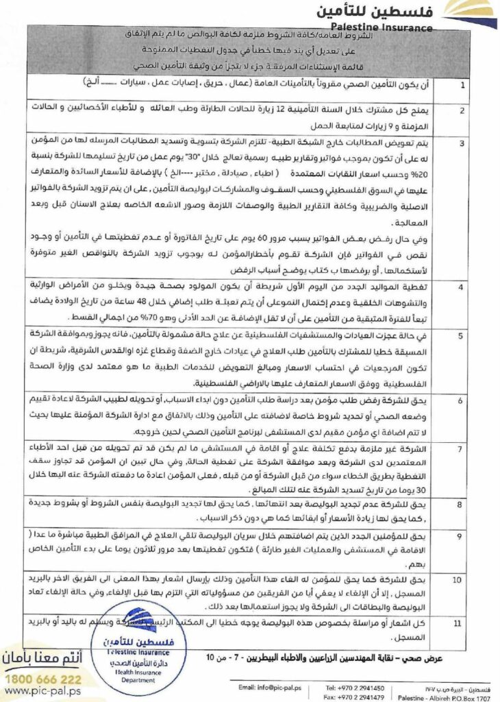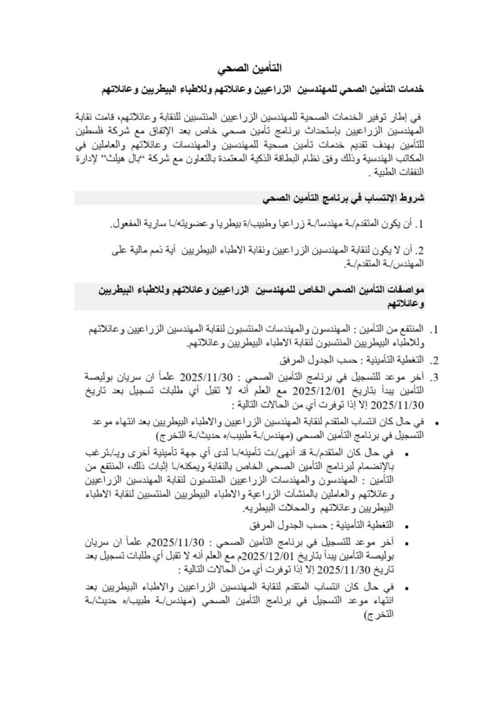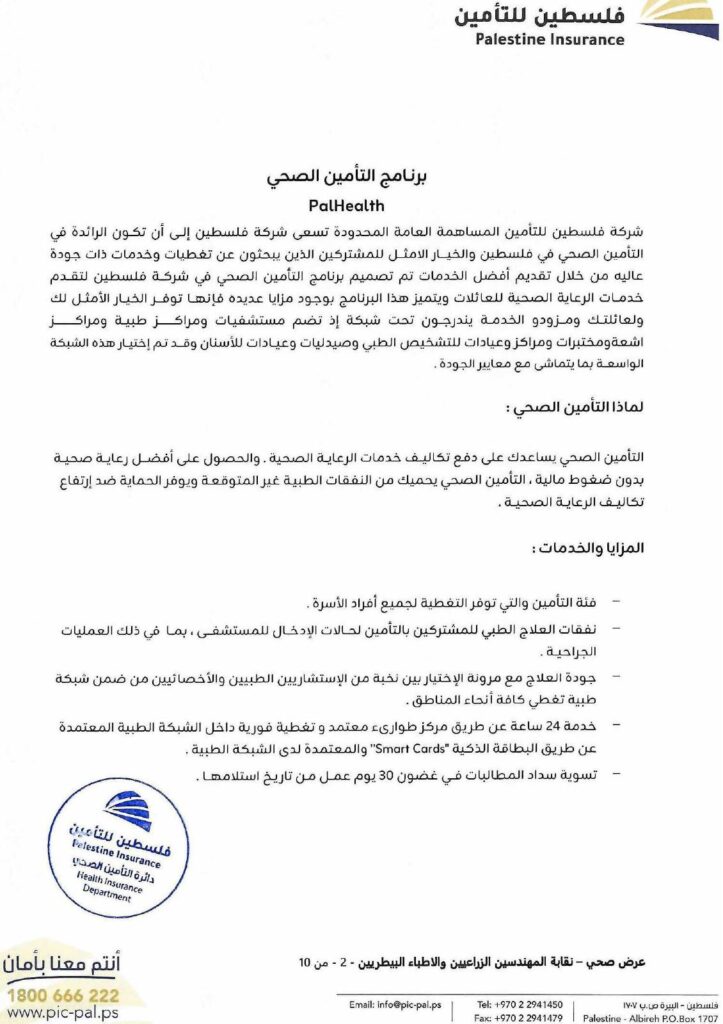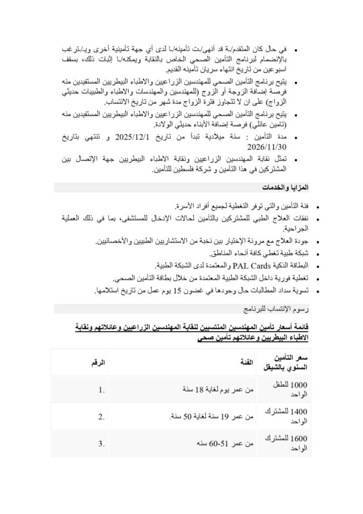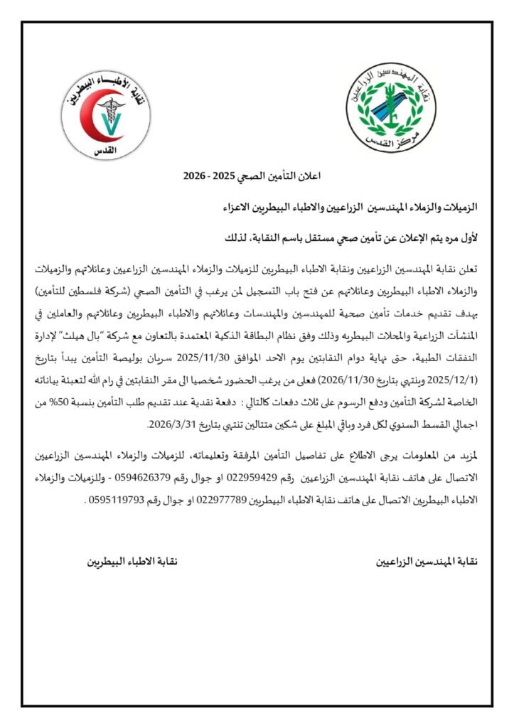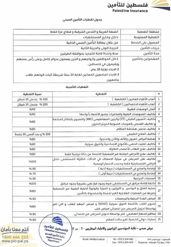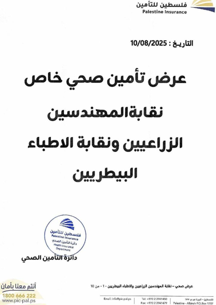 تضع نقابة الأطباء البيطريين / مركز القدس بين أيديكم الوثيقة الرسمية لاتفاقية التأمين الصحي الشامل، والموقّعة مع شركة فلسطين للتأمين.