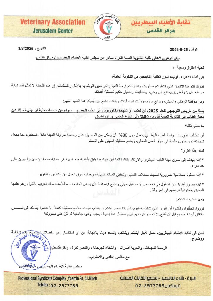 الرئيسية/أخبار النقابة/بيان توعوي لاهالي طلبة الثانوية العامة الكرام أخبار النقابة بيان توعوي لاهالي طلبة الثانوية العامة الكرام صادر عن مجلس نقابة الاطباء البيطريين / مركز القدس