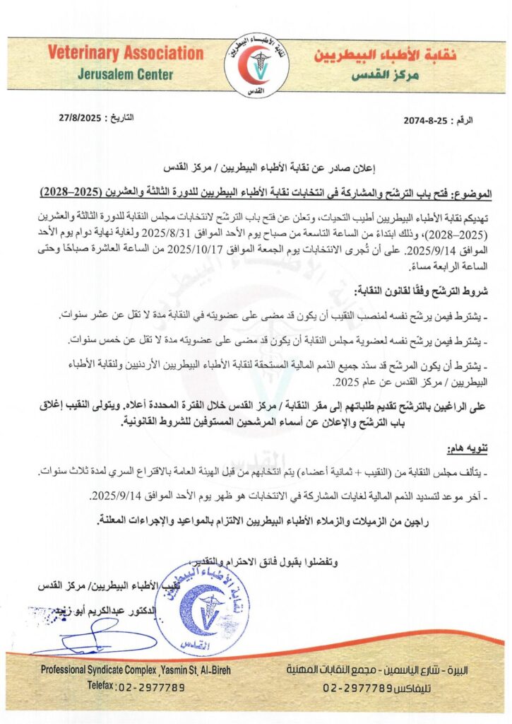 الرئيسية/أخبار النقابة/فتح باب الترشيح لانتخابات نقابة الأطباء البيطريين / مركز القدس لدورة 2025-2028 أخبار النقابةاعلانات النقابة فتح باب الترشيح لانتخابات نقابة الأطباء البيطريين / مركز القدس لدورة 2025-2028