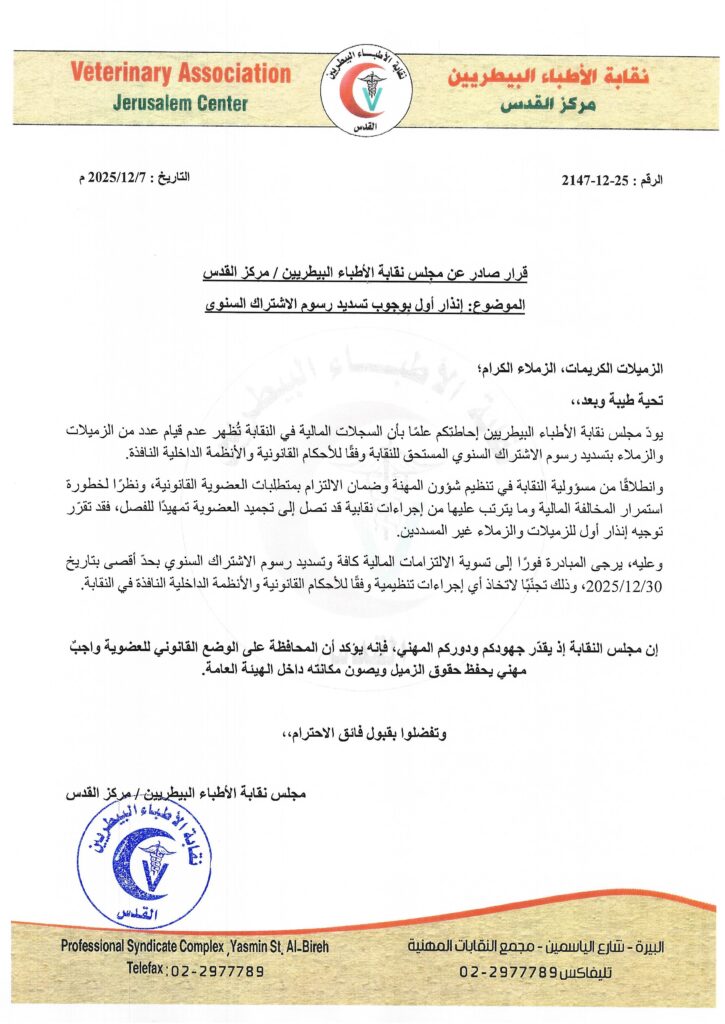 يودّ مجلس نقابة الأطباء البيطريين إحاطتكم علمًا بأن السجلات المالية في النقابة تُظهر عدم قيام عدد من الزميلات والزملاء بتسديد رسوم الاشتراك السنوي المستحق للنقابة وفقًا للأحكام القانونية والأنظمة الداخلية النافذة.