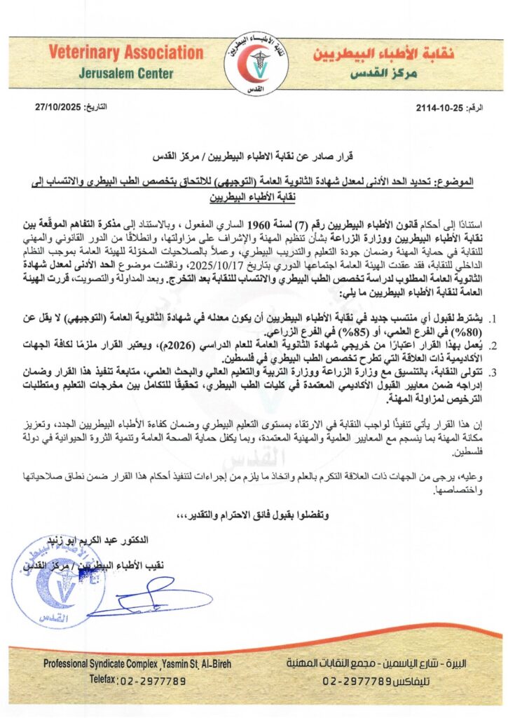 الرئيسية/اعلانات النقابة/قرار صادر عن نقابة الاطباء البيطريين اعلانات النقابة قرار صادر عن نقابة الاطباء البيطريين