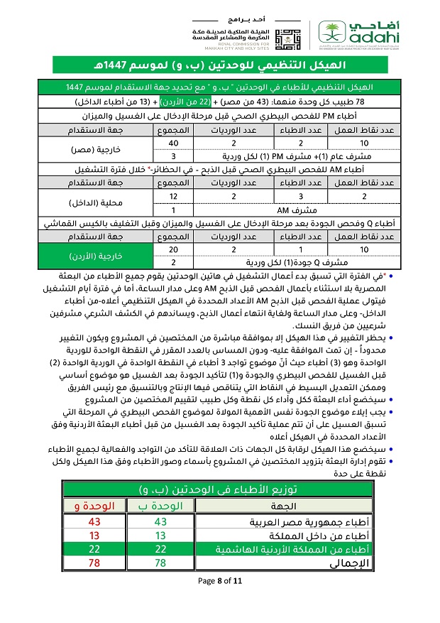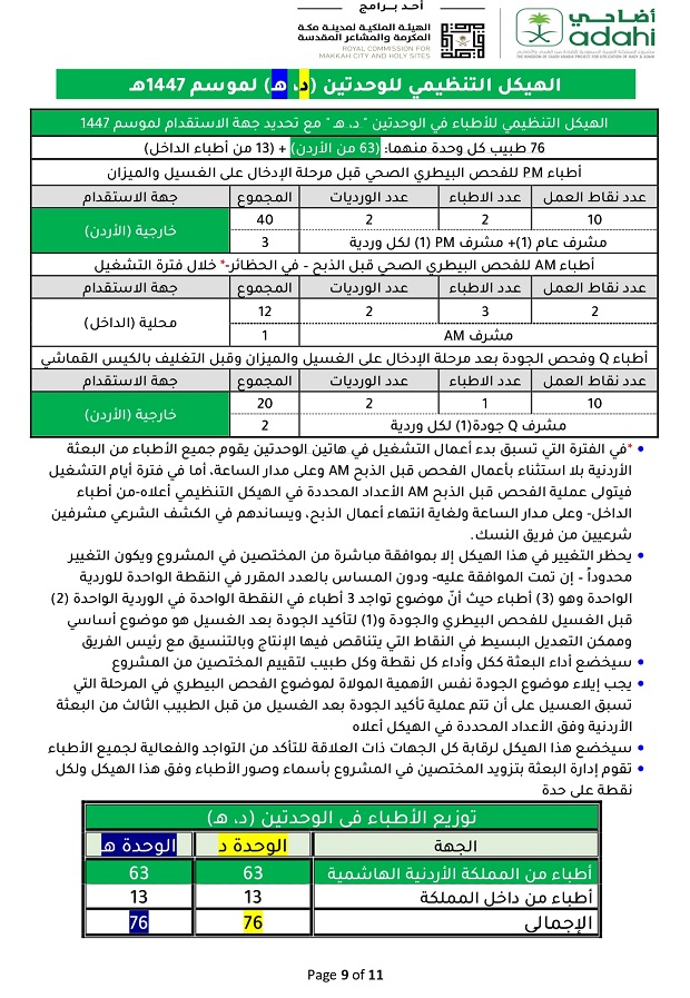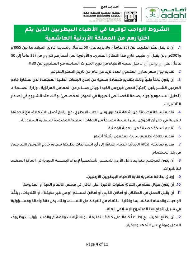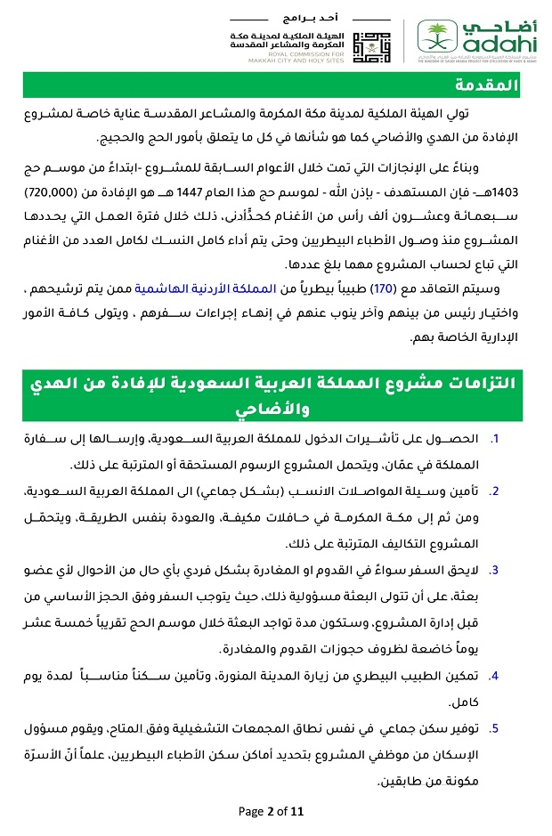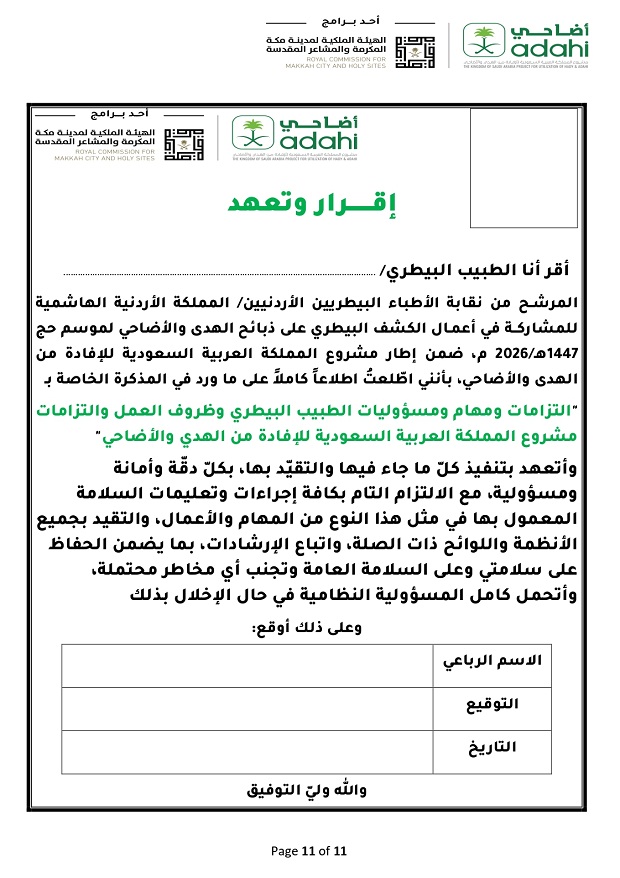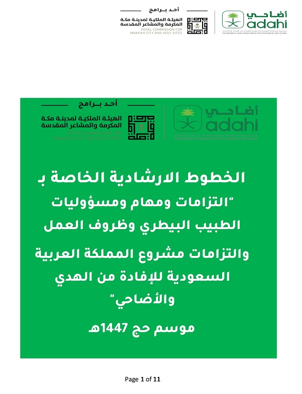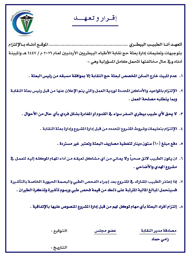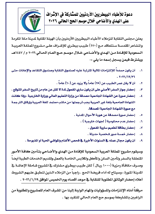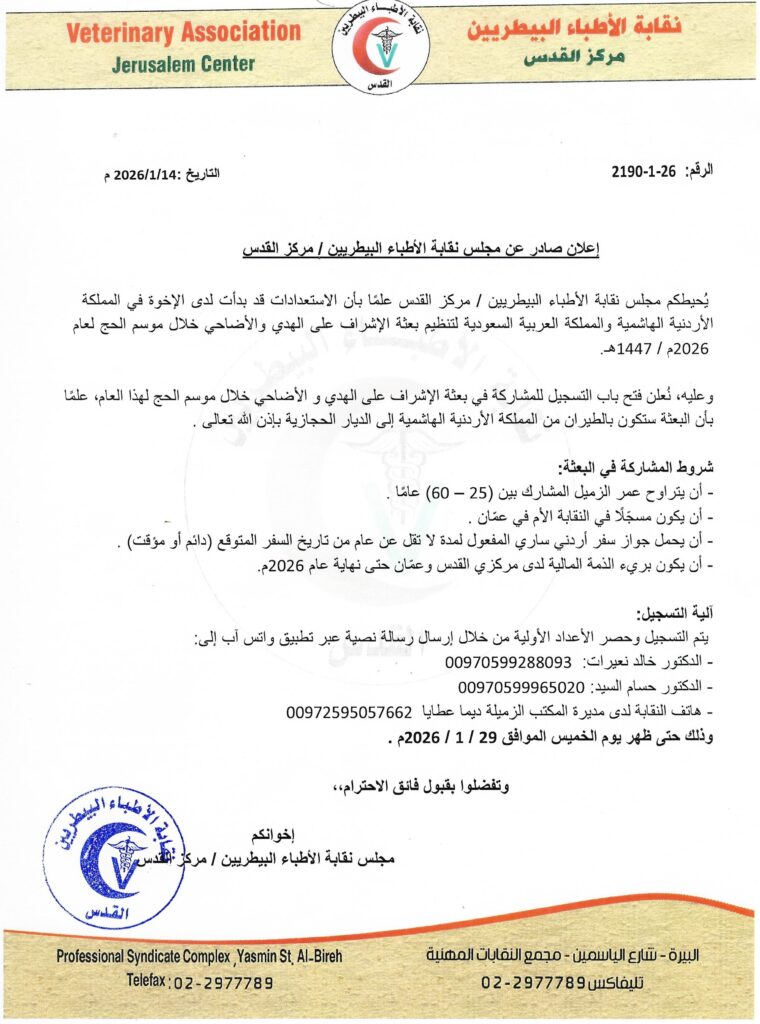 يُحيطكم مجلس نقابة الأطباء البيطريين / مركز القدس علمًا بأن الاستعدادات قد بدأت لدى الإخوة في المملكة الأردنية الهاشمية والمملكة العربية السعودية لتنظيم بعثة الإشراف على الهدي والأضاحي خلال موسم الحج لعام 2026م / 1447هـ.
