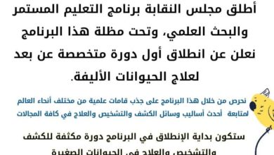 تعلن نقابة الأطباء البيطريين / مركز القدس ، ضمن برنامج التعليم المستمر و البحث العلمي عن فتح باب التسجيل للقسم…
